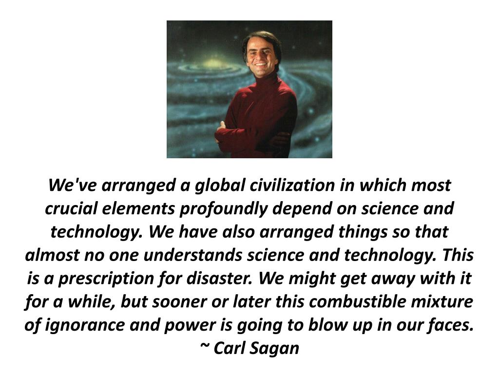 We've arranged a global civilization in which most crucial elements profoundly depend on science and technology. We have also arranged things so that almost no one understands science and technology. This is a prescription for disaster. We might get away with it for a while, but sooner or later this combustible mixture of ignorance and power is going to blow up in our faces. ~ Carl Sagan