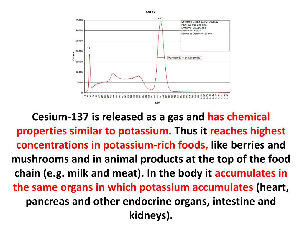 Cesium-137 is released as a gas and has chemical properties similar to potassium.Thus it reaches highest concentrations in potassium-rich foods,like berries and mushrooms and in animal products at the top of the food chain (e.g. milk and meat). In the body it accumulates in the same organs in which potassium accumulates(heart, pancreas and other endocrine organs, intestine and kidneys).