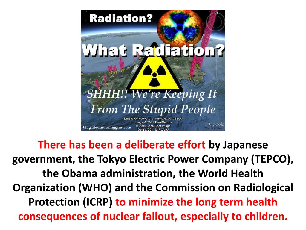 There has been a deliberate effortby Japanese government, the Tokyo Electric Power Company (TEPCO), the Obama administration, the World Health Organization (WHO) and the Commission on Radiological Protection (ICRP) to minimize the long term health consequences of nuclear fallout, especially to children.