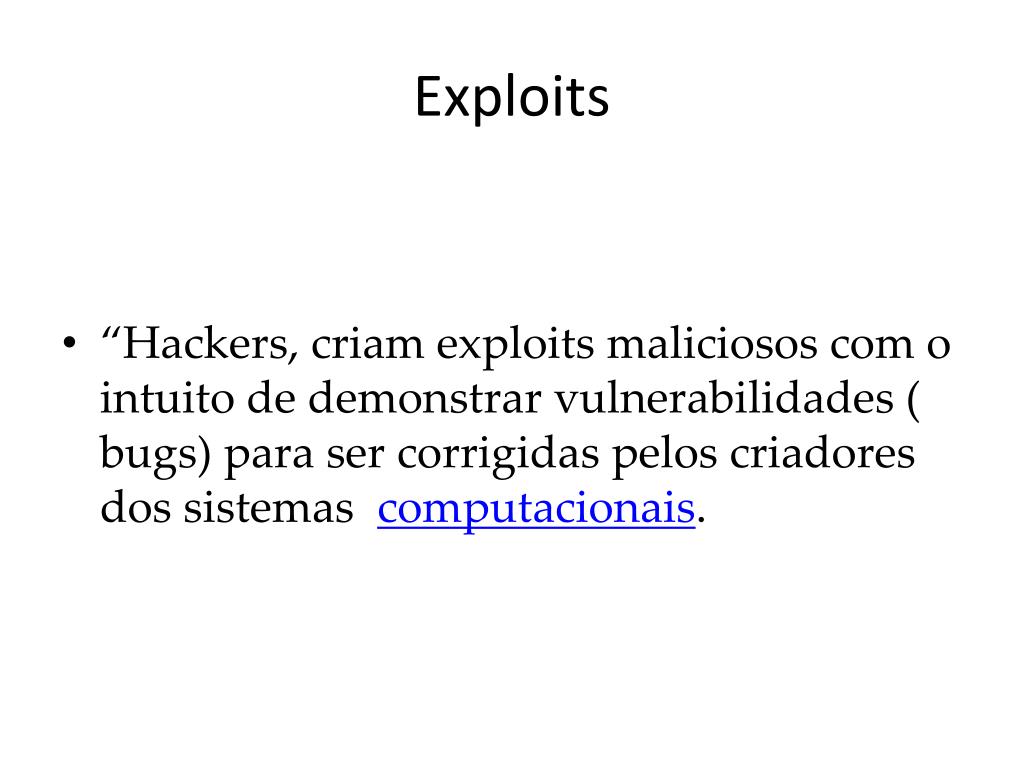 Exploits • “Hackers, criam exploits maliciosos com o intuito de demonstrar vulnerabilidades ( bugs) para ser corrigidas pelos criadores dos sistemas computacionais.