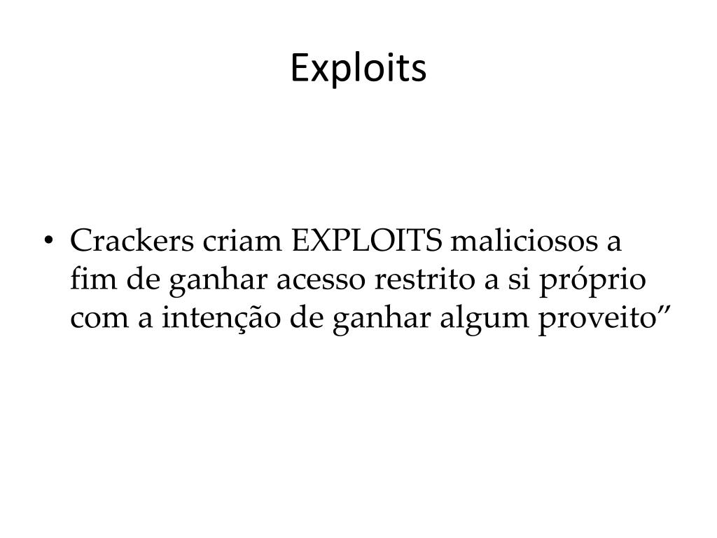 Exploits • Crackers criam EXPLOITS maliciosos a fim de ganhar acesso restrito a si próprio com a intenção de ganhar algum proveito”