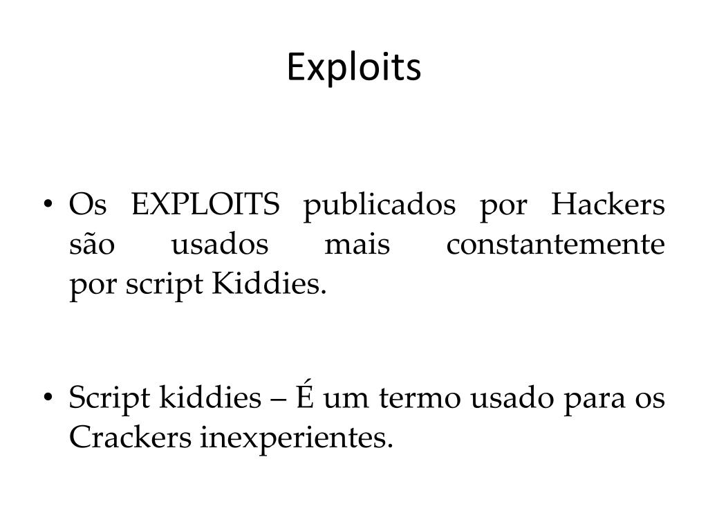 Exploits • Os EXPLOITS publicados por Hackers são usados mais constantemente por script Kiddies. • Script kiddies – É um termo usado para os Crackers inexperientes.