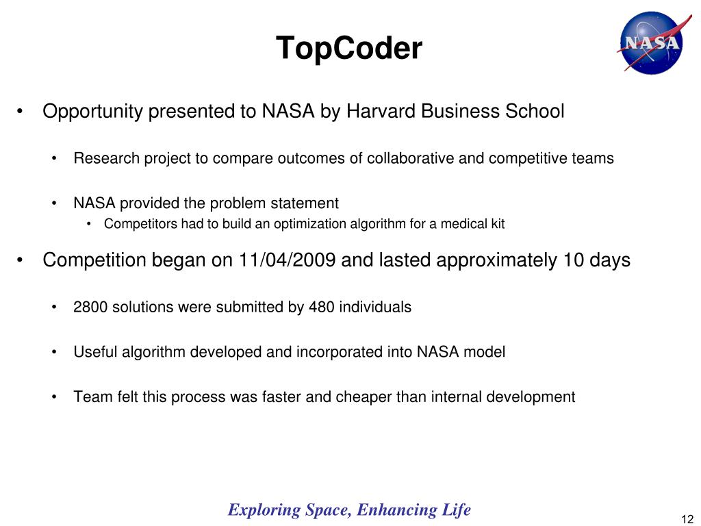TopCoder • Opportunity presented to NASA by Harvard Business School • Research project to compare outcomes of collaborative and competitive teams • NASA provided the problem statement • Competitors had to build an optimization algorithm for a medical kit • Competition began on 11/04/2009 and lasted approximately 10 days • 2800 solutions were submitted by 480 individuals • Useful algorithm developed and incorporated into NASA model • Team felt this process was faster and cheaper than internal development