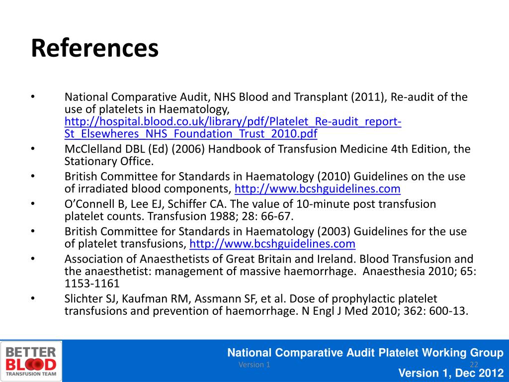 References • National Comparative Audit, NHS Blood and Transplant (2011), Re-audit of the use of platelets in Haematology, http://hospital.blood.co.uk/library/pdf/Platelet_Re-audit_report-St_Elsewheres_NHS_Foundation_Trust_2010.pdf • McClelland DBL (Ed) (2006) Handbook of Transfusion Medicine 4th Edition, the Stationary Office. • British Committee for Standards in Haematology (2010) Guidelines on the use of irradiated blood components, http://www.bcshguidelines.com • O’Connell B, Lee EJ, Schiffer CA. The value of 10-minute post transfusion platelet counts. Transfusion 1988; 28: 66-67. • British Committee for Standards in Haematology (2003) Guidelines for the use of platelet transfusions, http://www.bcshguidelines.com • Association of Anaesthetists of Great Britain and Ireland. Blood Transfusion and the anaesthetist: management of massive haemorrhage. Anaesthesia 2010; 65: 1153-1161 • Slichter SJ, Kaufman RM, Assmann SF, et al. Dose of prophylactic platelet transfusions and prevention of haemorrhage. N Engl J Med 2010; 362: 600-13. Version 1