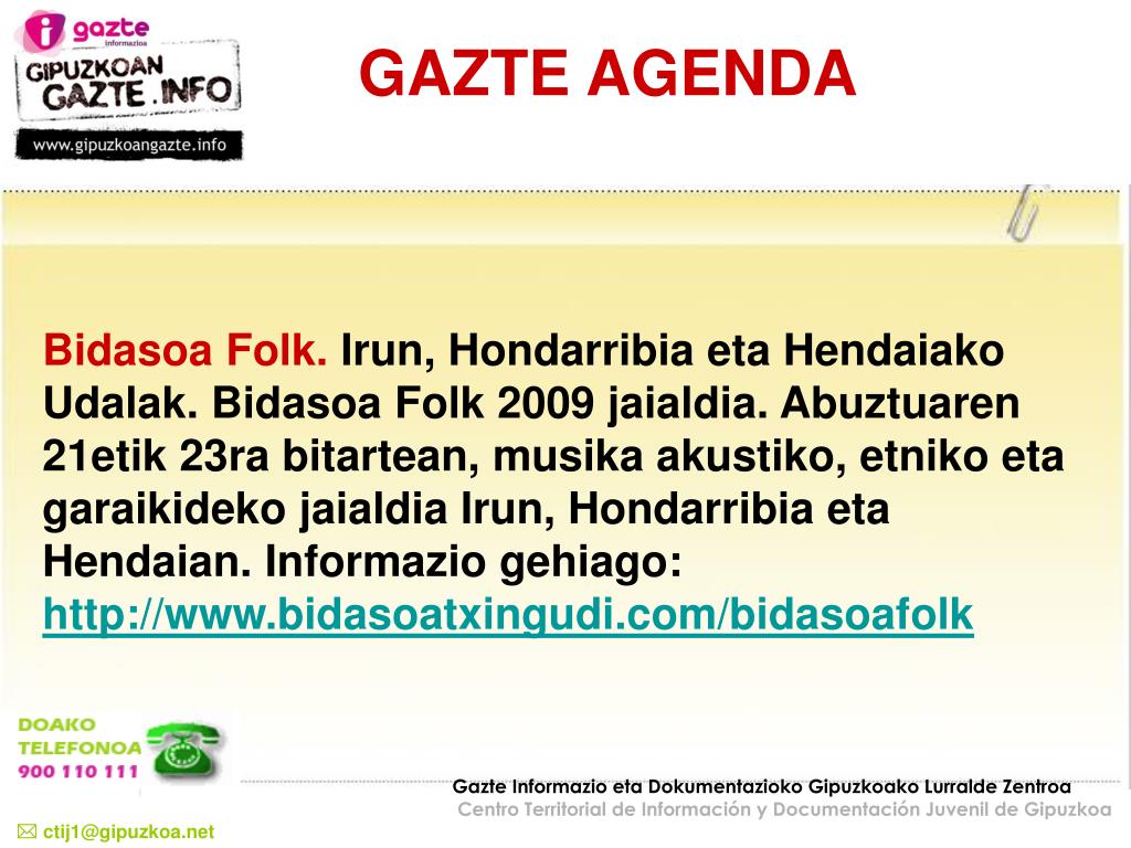 GAZTE AGENDA Bidasoa Folk. Irun, Hondarribia eta Hendaiako Udalak. Bidasoa Folk 2009 jaialdia. Abuztuaren 21etik 23ra bitartean, musika akustiko, etniko eta garaikideko jaialdia Irun, Hondarribia eta Hendaian. Informazio gehiago: http://www.bidasoatxingudi.com/bidasoafolk Gazte Informazio eta Dokumentazioko Gipuzkoako Lurralde Zentroa Centro Territorial de Información y Documentación Juvenil de Gipuzkoa ctij1@gipuzkoa.net
