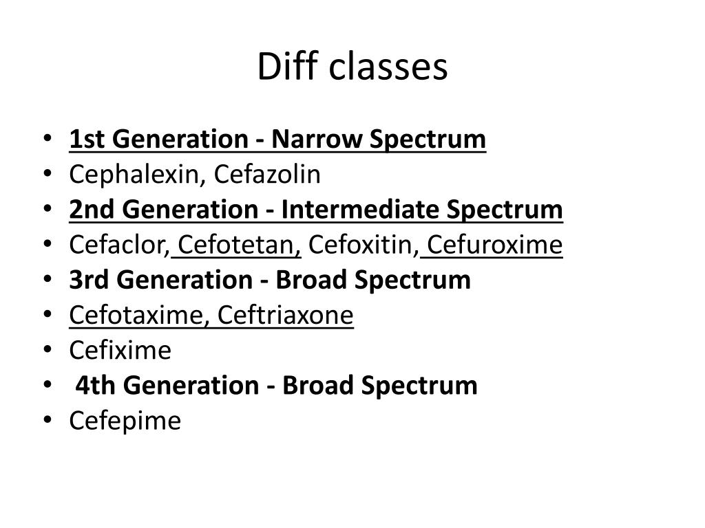 Diff classes • 1st Generation - Narrow Spectrum • Cephalexin, Cefazolin • 2nd Generation - Intermediate Spectrum • Cefaclor,Cefotetan,Cefoxitin,Cefuroxime • 3rd Generation - Broad Spectrum • Cefotaxime, Ceftriaxone • Cefixime • 4th Generation - Broad Spectrum • Cefepime