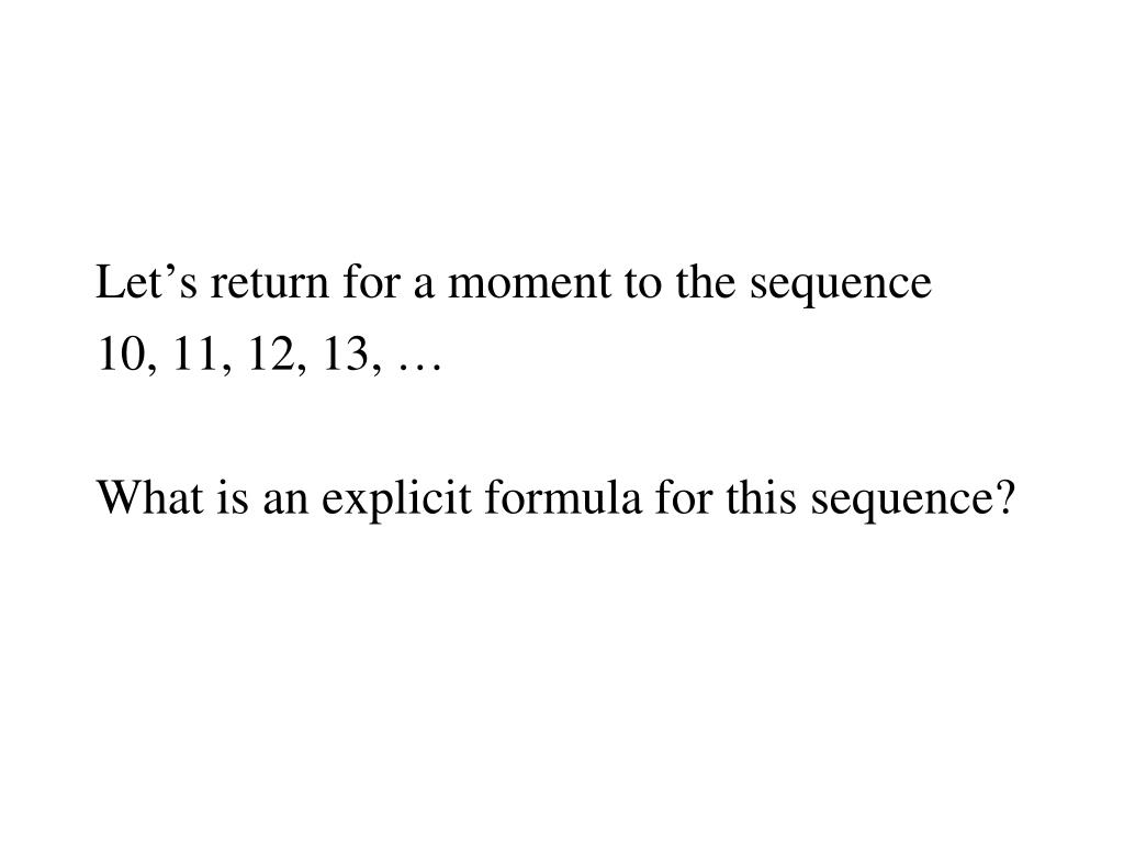 Let’s return for a moment to the sequence 10, 11, 12, 13, … What is an explicit formula for this sequence?