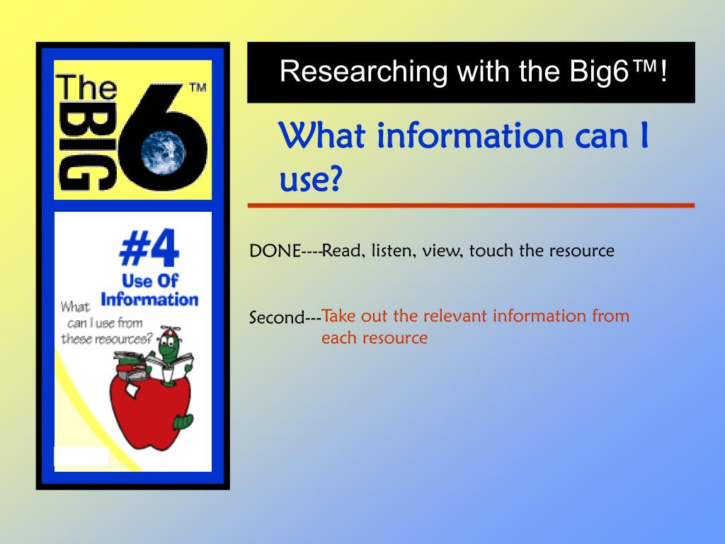Researching with the Big6™! What information can I use? Read, listen, view, touch the resource Take out the relevant information from each resource DONE---- Second---
