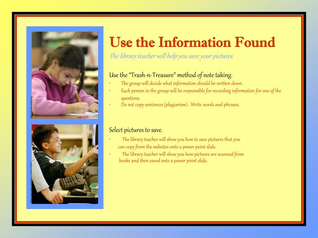 Use the Information Found • The library teacher will help you save your pictures. • Use the “Trash-n-Treasure” method of note taking. • The group will decide what information should be written down. • Each person in the group will be responsible for recording information for one of the questions. • Do not copy sentences (plagiarism). Write words and phrases. • Select pictures to save. • The library teacher will show you how to save pictures that you • can copy from the websites onto a power point slide. • The library teacher will show you how pictures are scanned from • books and then savedonto a power point slide. http://www.spps.org http://www.fno.org/jan04/gppic.html