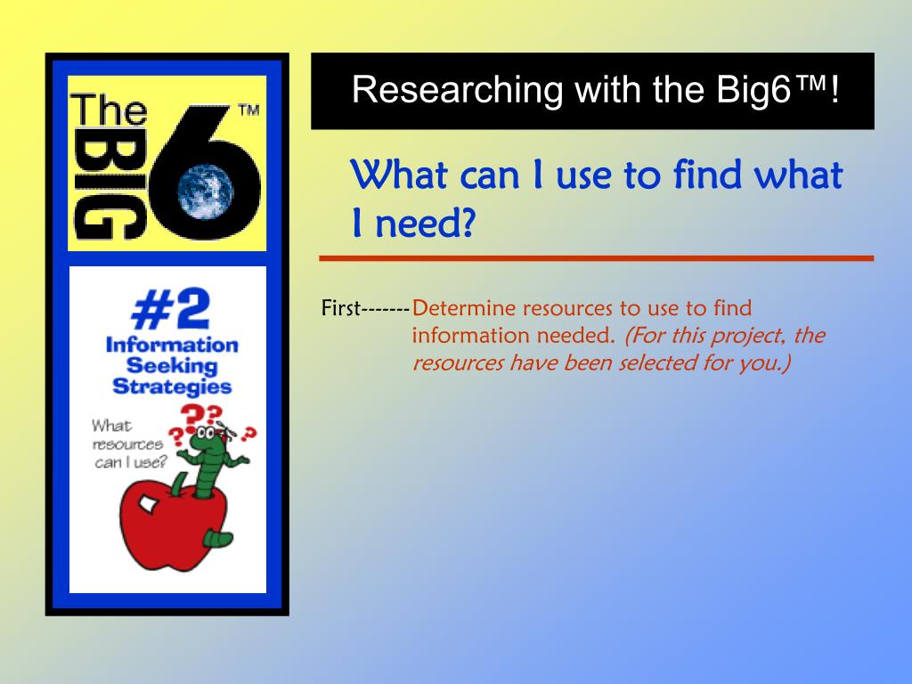 Researching with the Big6™! What can I use to find what I need? First------- Determine resources to use to find information needed. (For this project, the resources have been selected for you.)
