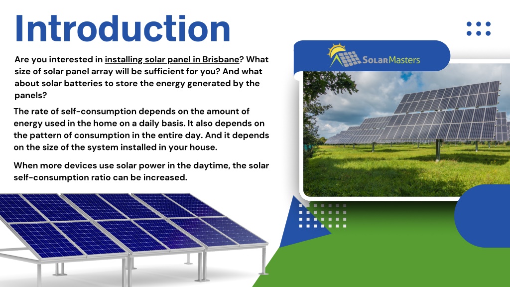 Introduction Are you interested in installing solar panel in Brisbane? What size of solar panel array will be sufficient for you? And what about solar batteries to store the energy generated by the panels? The rate of self-consumption depends on the amount of energy used in the home on a daily basis. It also depends on the pattern of consumption in the entire day. And it depends on the size of the system installed in your house. When more devices use solar power in the daytime, the solar self-consumption ratio can be increased.