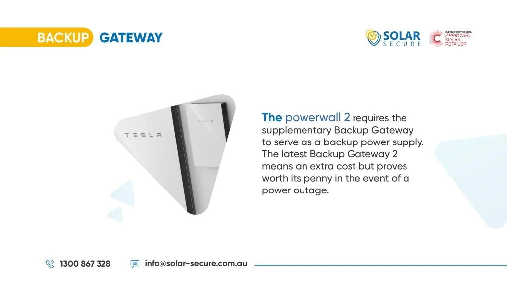 BACKUP GATEWAY The powerwall 2 requires the supplementary Backup Gateway to serve as a backup power supply. The latest Backup Gateway 2 means an extra cost but proves worth its penny in the event of a power outage. info@solar-secure.com.au 1300 867 328