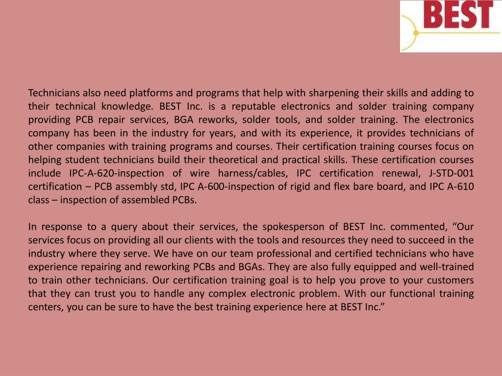 Technicians also need platforms and programs that help with sharpening their skills and adding to their technical knowledge. BEST Inc. is a reputable electronics and solder training company providing PCB repair services, BGA reworks, solder tools, and solder training. The electronics company has been in the industry for years, and with its experience, it provides technicians of other companies with training programs and courses. Their certification training courses focus on helping student technicians build their theoretical and practical skills. These certification courses include IPC-A-620-inspection of wire harness/cables, IPC certification renewal, J-STD-001 certification – PCB assembly std, IPC A-600-inspection of rigid and flex bare board, and IPC A-610 class – inspection of assembled PCBs. In response to a query about their services, the spokesperson of BEST Inc. commented, “Our services focus on providing all our clients with the tools and resources they need to succeed in the industry where they serve. We have on our team professional and certified technicians who have experience repairing and reworking PCBs and BGAs. They are also fully equipped and well-trained to train other technicians. Our certification training goal is to help you prove to your customers that they can trust you to handle any complex electronic problem. With our functional training centers, you can be sure to have the best training experience here at BEST Inc.”