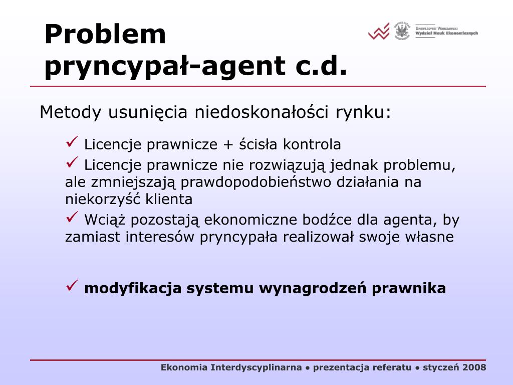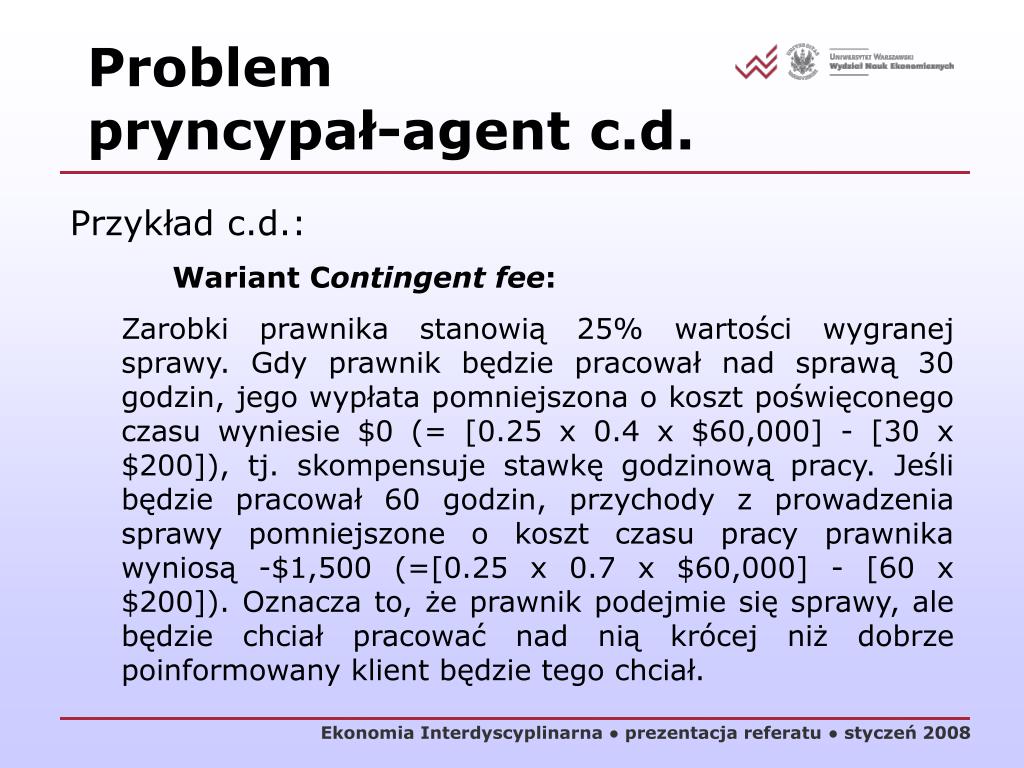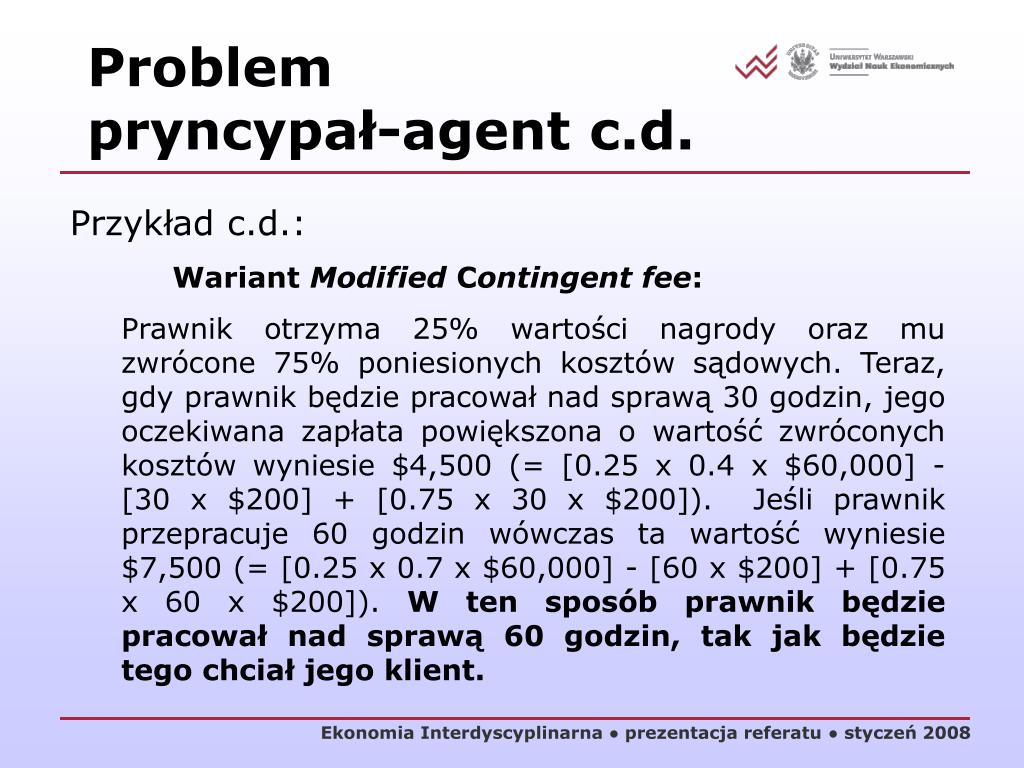 Problempryncypał-agent c.d. • Przykład c.d.: • Wariant Modified Contingent fee: • Prawnik otrzyma 25% wartości nagrody oraz mu zwrócone 75% poniesionych kosztów sądowych. Teraz, gdy prawnik będzie pracował nad sprawą 30 godzin, jego oczekiwana zapłata powiększona o wartość zwróconych kosztów wyniesie $4,500 (= [0.25 x 0.4 x $60,000] - [30 x $200] + [0.75 x 30 x $200]). Jeśli prawnik przepracuje 60 godzin wówczas ta wartość wyniesie $7,500 (= [0.25 x 0.7 x $60,000] - [60 x $200] + [0.75 x 60 x $200]).W ten sposób prawnik będzie pracował nad sprawą 60 godzin, tak jak będzie tego chciał jego klient. Ekonomia Interdyscyplinarna ● prezentacja referatu ● styczeń 2008