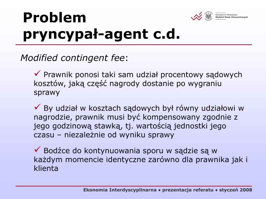 Problempryncypał-agent c.d. • Contingent fee w tradycyjnej postaci: • Prawnik otrzyma udział w postaci części zasądzonej na korzyść klienta kwoty w wygranym przez niego procesie • Prawnik ponosi nieproporcjonalnie wyższą część kosztów sądowych – zwykle 100% • Gdy koszty sądowe przekroczą wartość oczekiwanych wpływów po wygraniu sprawy, prawnikowi nie opłaca się dalej zajmować sprawą, co dalej może być w najlepszym interesie klienta Ekonomia Interdyscyplinarna ● prezentacja referatu ● styczeń 2008
