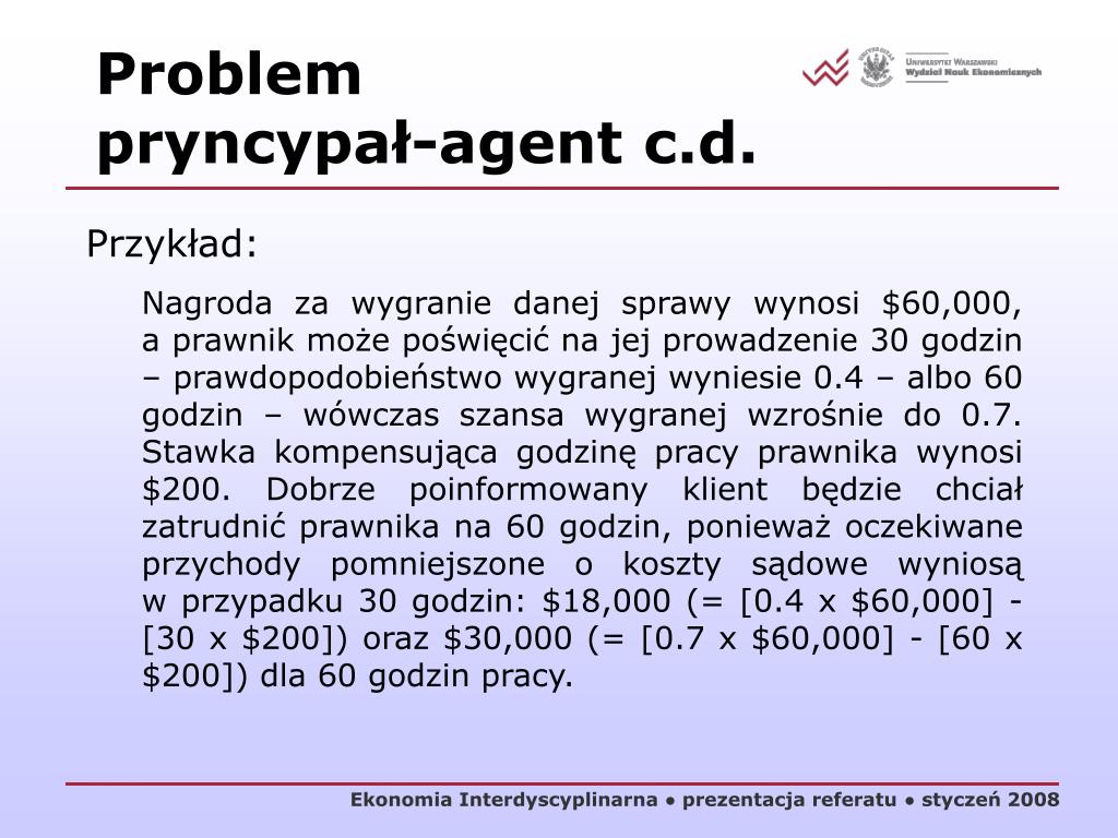 Problempryncypał-agent c.d. • Przykład: • Nagroda za wygranie danej sprawy wynosi $60,000,a prawnik może poświęcić na jej prowadzenie 30 godzin – prawdopodobieństwo wygranej wyniesie 0.4 – albo 60 godzin – wówczas szansa wygranej wzrośnie do 0.7. Stawka kompensująca godzinę pracy prawnika wynosi $200. Dobrze poinformowany klient będzie chciał zatrudnić prawnika na 60 godzin, ponieważ oczekiwaneprzychody pomniejszone o koszty sądowe wyniosąw przypadku 30 godzin: $18,000 (= [0.4 x $60,000] - [30 x $200]) oraz $30,000(= [0.7 x $60,000] - [60 x $200]) dla 60 godzin pracy. Ekonomia Interdyscyplinarna ● prezentacja referatu ● styczeń 2008