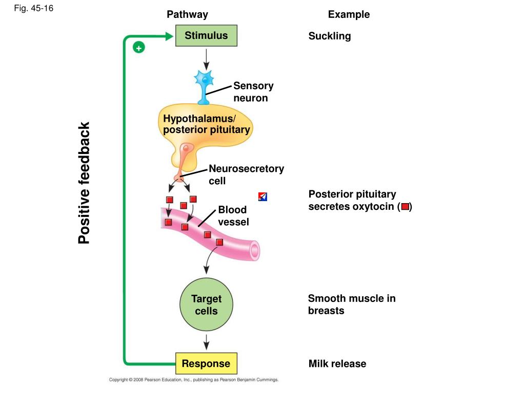 Fig. 45-16 Pathway Example Stimulus Suckling + Sensoryneuron Hypothalamus/posterior pituitary Positive feedback Neurosecretorycell Posterior pituitarysecretes oxytocin ( ) Bloodvessel Smooth muscle inbreasts Targetcells Response Milk release