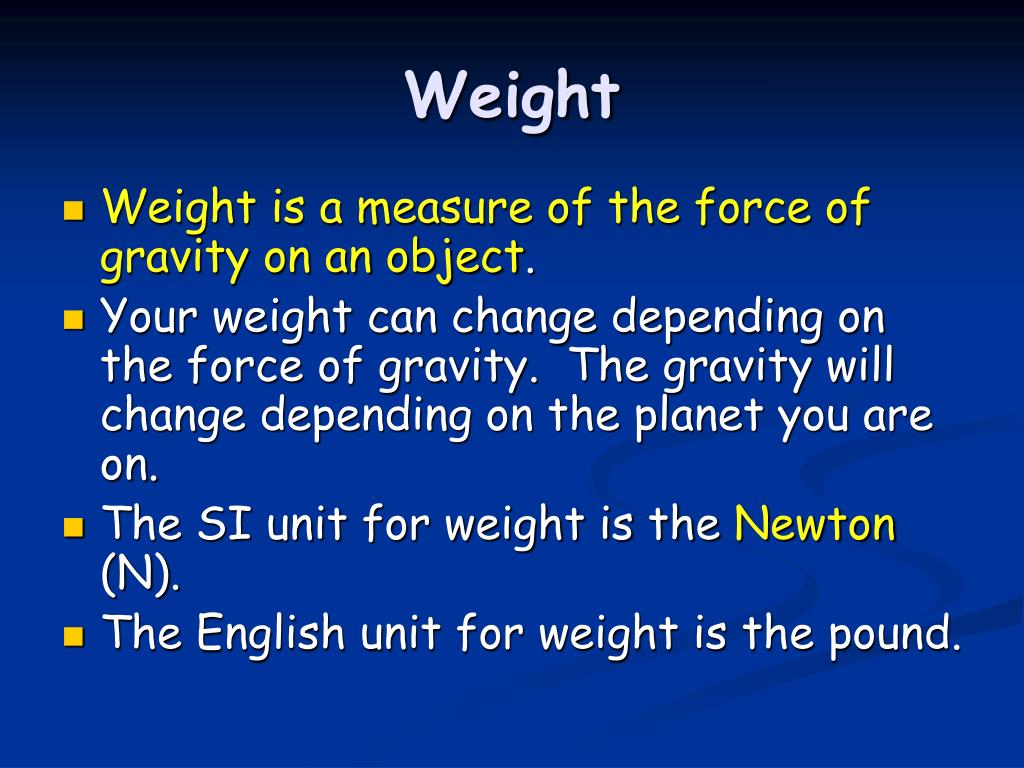 Weight • Weight is a measure of the force of gravity on an object. • Your weight can change depending on the force of gravity. The gravity will change depending on the planet you are on. • The SI unit for weight is the Newton (N). • The English unit for weight is the pound.