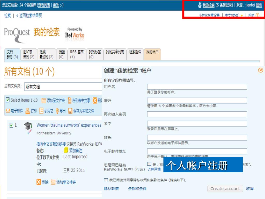 ProQuest 在线个人帐户 • 信息在线文件夹管理(多层) • 检索与定题管理 • 标签主题和共享列表 • 制作检索插件 • 与RefWorks信息管理工具帐户交互