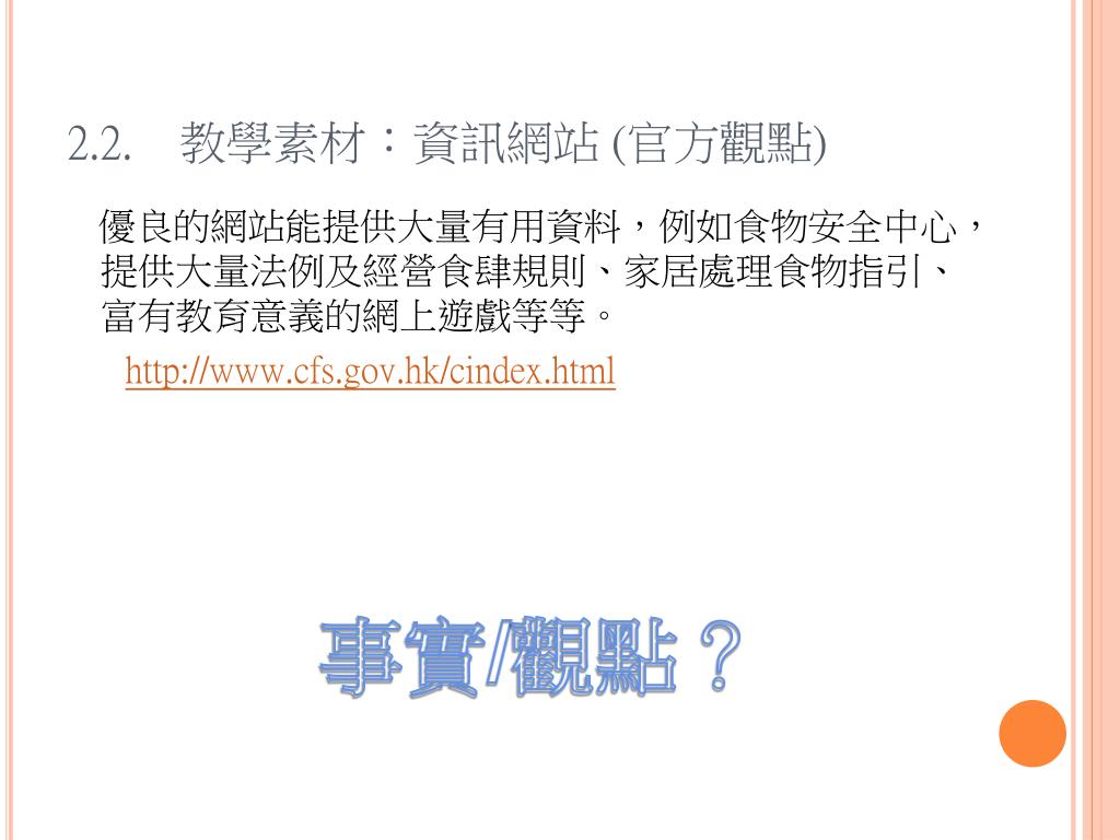 2.2. 教學素材:資訊網站 (官方觀點) 優良的網站能提供大量有用資料,例如食物安全中心,提供大量法例及經營食肆規則、家居處理食物指引、富有教育意義的網上遊戲等等。 http://www.cfs.gov.hk/cindex.html 事實/觀點?