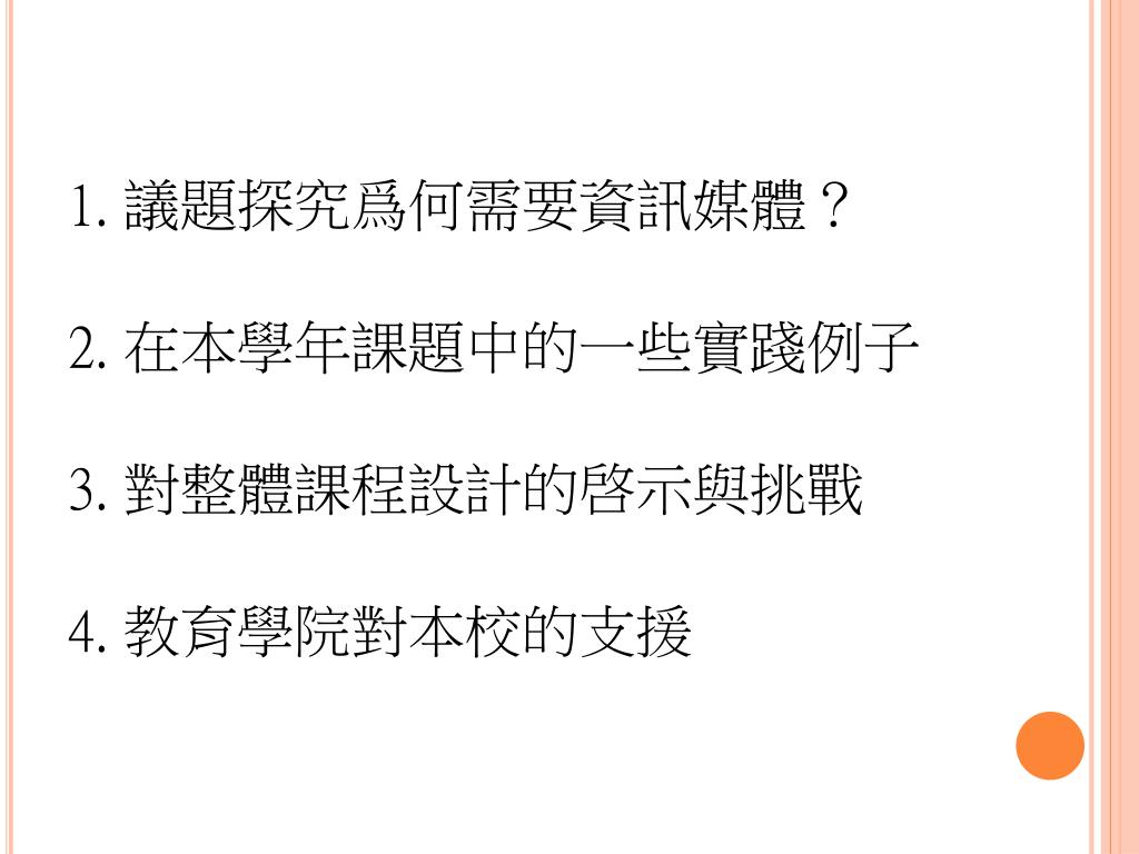 1. 議題探究爲何需要資訊媒體? 2. 在本學年課題中的一些實踐例子 3. 對整體課程設計的啓示與挑戰 4. 教育學院對本校的支援