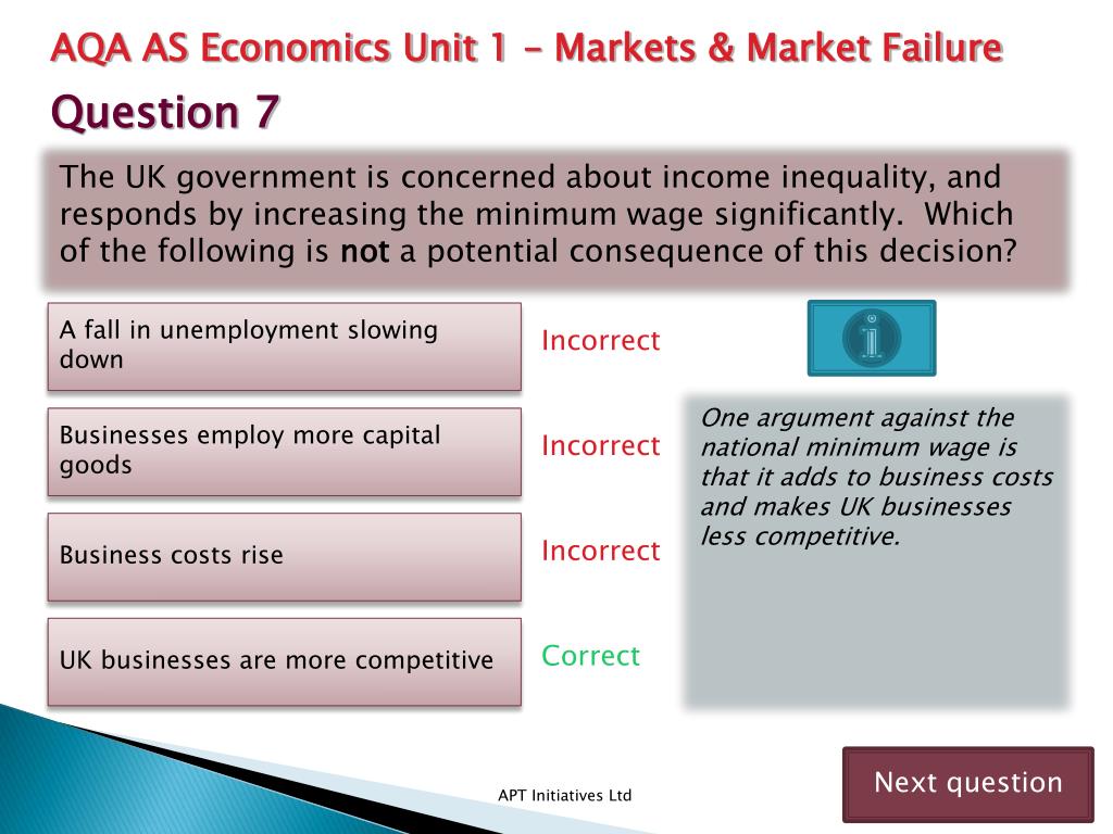 AQA AS Economics Unit 1 – Markets & Market Failure Question 7 The UK government is concerned about income inequality, and responds by increasing the minimum wage significantly. Which of the following is not a potential consequence of this decision? A fall in unemployment slowing down Incorrect One argument against the national minimum wage is that it adds to business costs and makes UK businesses less competitive. Businesses employ more capital goods Incorrect Business costs rise Incorrect UK businesses are more competitive Correct Next question APT Initiatives Ltd