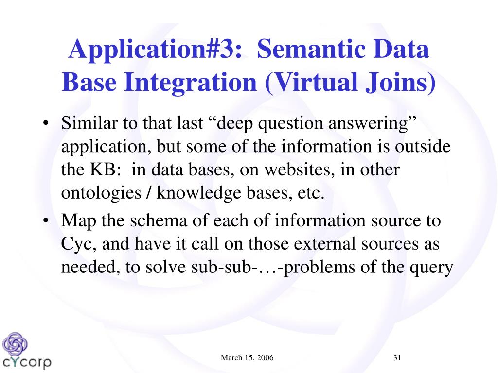 Application#3: Semantic Data Base Integration (Virtual Joins) • Similar to that last “deep question answering” application, but some of the information is outside the KB: in data bases, on websites, in other ontologies / knowledge bases, etc. • Map the schema of each of information source to Cyc, and have it call on those external sources as needed, to solve sub-sub-…-problems of the query