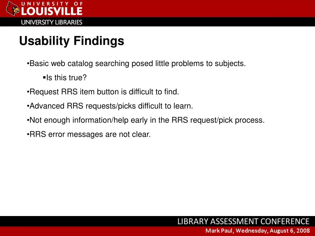 Usability Findings • Basic web catalog searching posed little problems to subjects. • Is this true? • Request RRS item button is difficult to find. • Advanced RRS requests/picks difficult to learn. • Not enough information/help early in the RRS request/pick process. • RRS error messages are not clear.