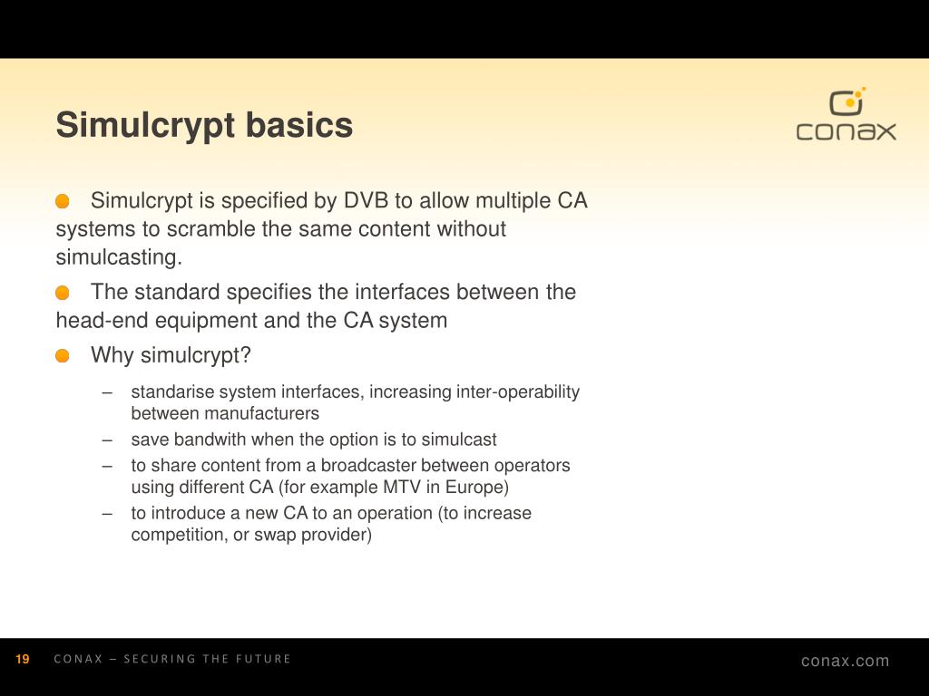 Simulcrypt basics CONAX – SECURING THE FUTURE • Simulcrypt is specified by DVB to allow multiple CA systems to scramble the same content without simulcasting. • The standard specifies the interfaces between the head-end equipment and the CA system • Why simulcrypt? • standarise system interfaces, increasing inter-operability between manufacturers • save bandwith when the option is to simulcast • to share content from a broadcaster between operators using different CA (for example MTV in Europe) • to introduce a new CA to an operation (to increase competition, or swap provider)