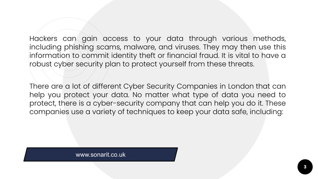 Cyber Security Companies: Safeguarding Your Data From Hackers! Safeguarding your data is crucial in the age of digital information. Cyber security companies work to protect your data from hackers who may try to access it without your permission. www.sonarit.co.uk 2