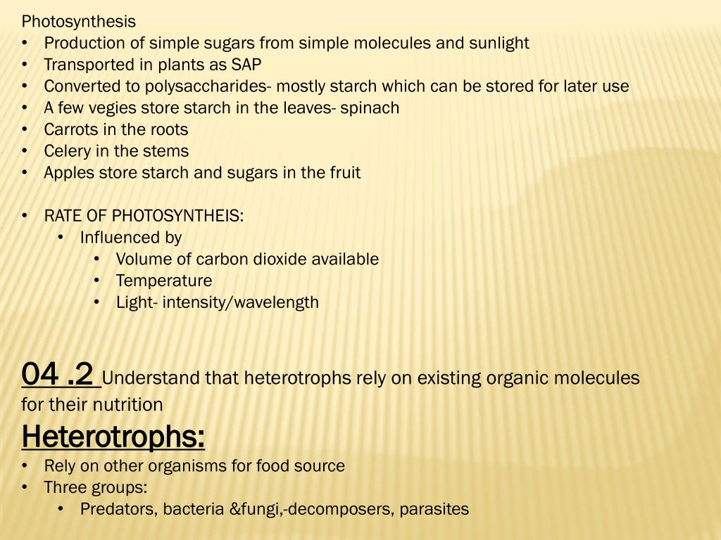 Photosynthesis • Production of simple sugars from simple molecules and sunlight • Transported in plants as SAP • Converted to polysaccharides- mostly starch which can be stored for later use • A few vegies store starch in the leaves- spinach • Carrots in the roots • Celery in the stems • Apples store starch and sugars in the fruit • RATE OF PHOTOSYNTHEIS: • Influenced by • Volume of carbon dioxide available • Temperature • Light- intensity/wavelength • 04 .2 Understand that heterotrophs rely on existing organic molecules for their nutrition • Heterotrophs: • Rely on other organisms for food source • Three groups: • Predators, bacteria &fungi,-decomposers, parasites