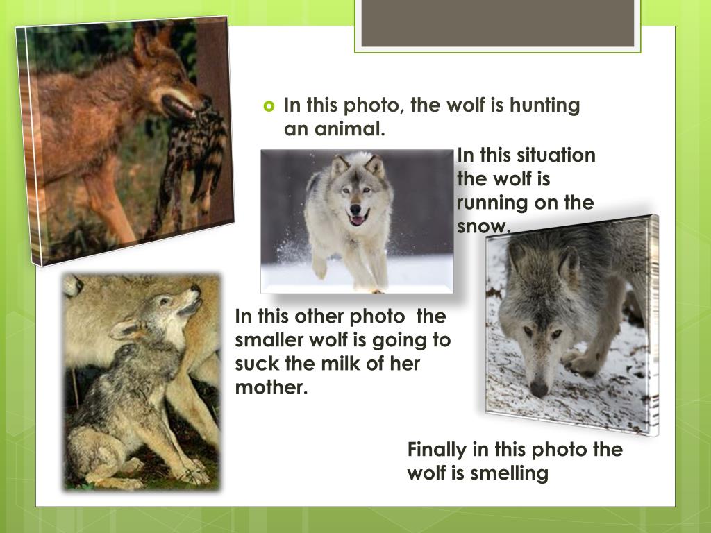 In this situation the wolf is running on the snow. • In this photo, the wolf is hunting an animal. In this other photo the smaller wolf is going to suck the milk of her mother. Finally in this photo the wolf is smelling