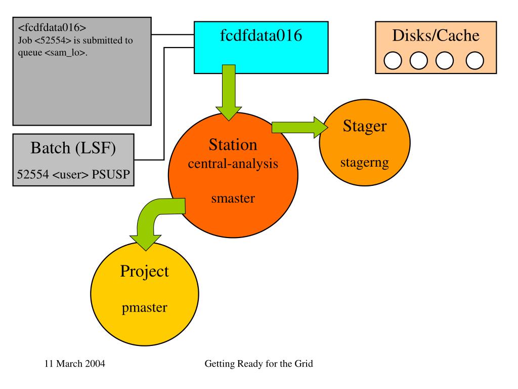 <fcdfdata016> Job <52554> is submitted to queue <sam_lo>. fcdfdata016 Disks/Cache Stager stagerng Station central-analysis smaster Batch (LSF) 52554 <user> PSUSP Project pmaster Getting Ready for the Grid