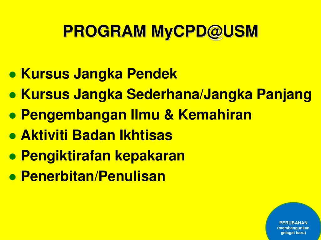 PROGRAM MyCPD@USM • Kursus Jangka Pendek • Kursus Jangka Sederhana/Jangka Panjang • Pengembangan Ilmu & Kemahiran • Aktiviti Badan Ikhtisas • Pengiktirafan kepakaran • Penerbitan/Penulisan PERUBAHAN (membangunkan gelagatbaru)