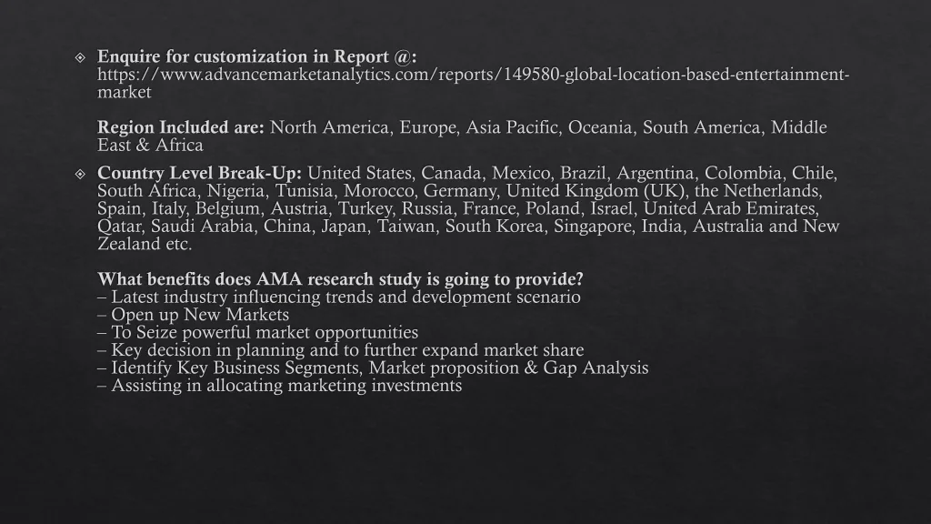 Enquire for customization in Report @: https://www.advancemarketanalytics.com/reports/149580-global-location-based-entertainment-marketRegion Included are: North America, Europe, Asia Pacific, Oceania, South America, Middle East & Africa • Country Level Break-Up: United States, Canada, Mexico, Brazil, Argentina, Colombia, Chile, South Africa, Nigeria, Tunisia, Morocco, Germany, United Kingdom (UK), the Netherlands, Spain, Italy, Belgium, Austria, Turkey, Russia, France, Poland, Israel, United Arab Emirates, Qatar, Saudi Arabia, China, Japan, Taiwan, South Korea, Singapore, India, Australia and New Zealand etc.What benefits does AMA research study is going to provide?– Latest industry influencing trends and development scenario– Open up New Markets– To Seize powerful market opportunities– Key decision in planning and to further expand market share– Identify Key Business Segments, Market proposition & Gap Analysis– Assisting in allocating marketing investments
