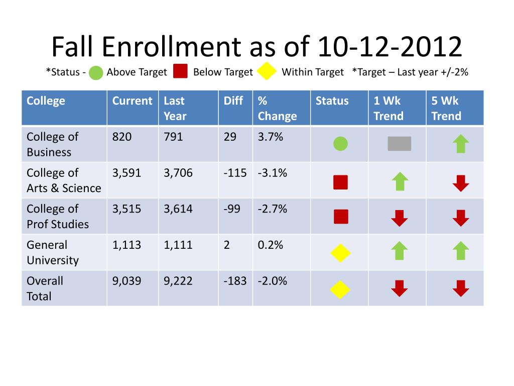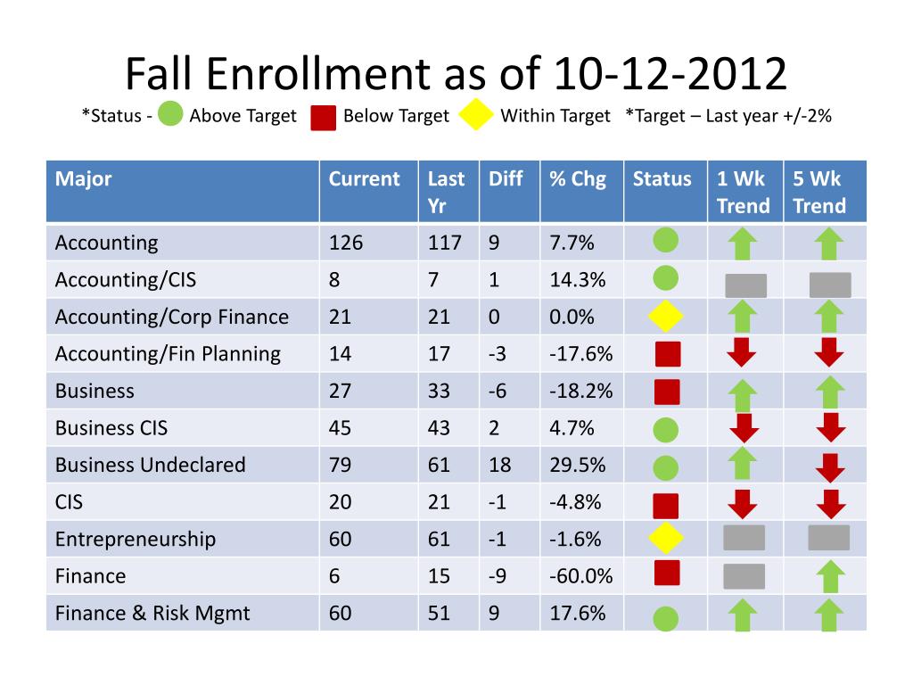 Fall Enrollment as of 10-12-2012*Status - Above Target Below Target Within Target *Target – Last year +/-2%