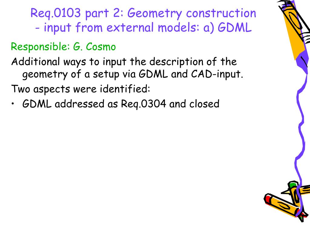 Req.0103 part 2: Geometry construction - input from external models: a) GDML Responsible: G. Cosmo Additional ways to input the description of the geometry of a setup via GDML and CAD-input. Two aspects were identified: • GDML addressed as Req.0304 and closed