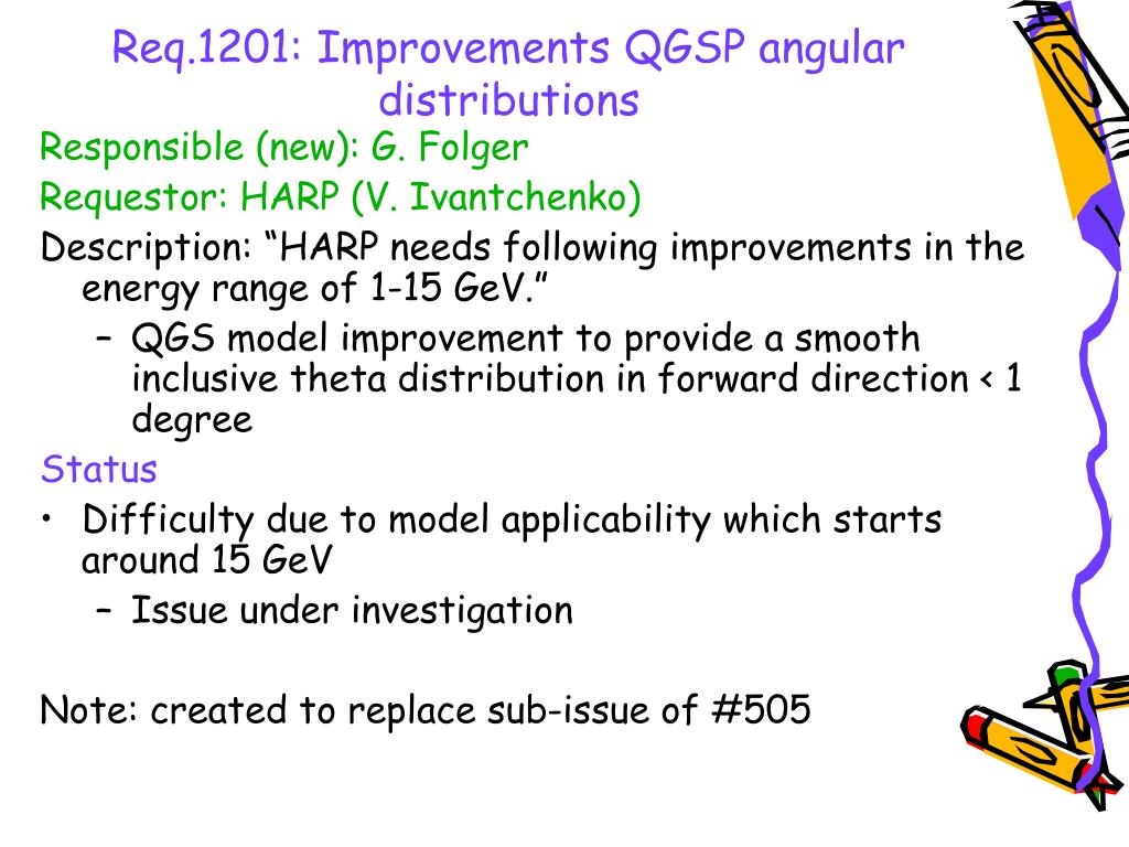 Req.1201: Improvements QGSP angular distributions Responsible (new): G. Folger Requestor: HARP (V. Ivantchenko) Description: “HARP needs following improvements in the energy range of 1-15 GeV.” QGS model improvement to provide a smooth inclusive theta distribution in forward direction < 1 degree Status Difficulty due to model applicability which starts around 15 GeV Issue under investigation Note: created to replace sub-issue of #505