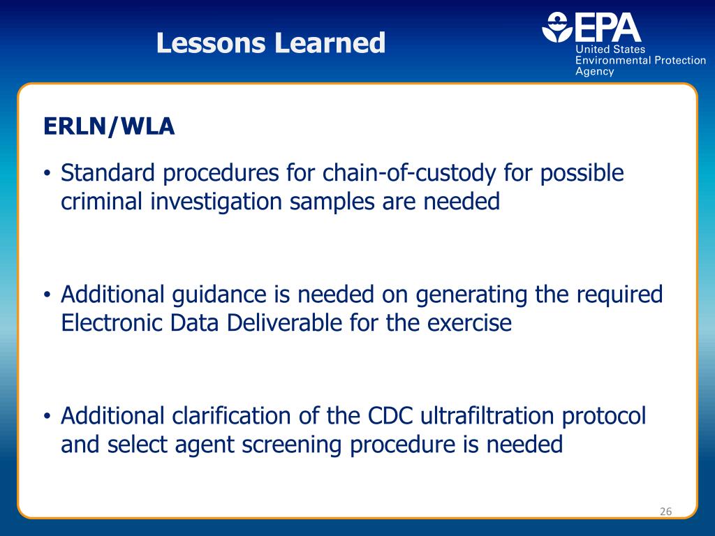 Lessons Learned ERLN/WLA • Standard procedures for chain-of-custody for possible criminal investigation samples are needed • Additional guidance is needed on generating the required Electronic Data Deliverable for the exercise • Additional clarification of the CDC ultrafiltration protocol and select agent screening procedure is needed