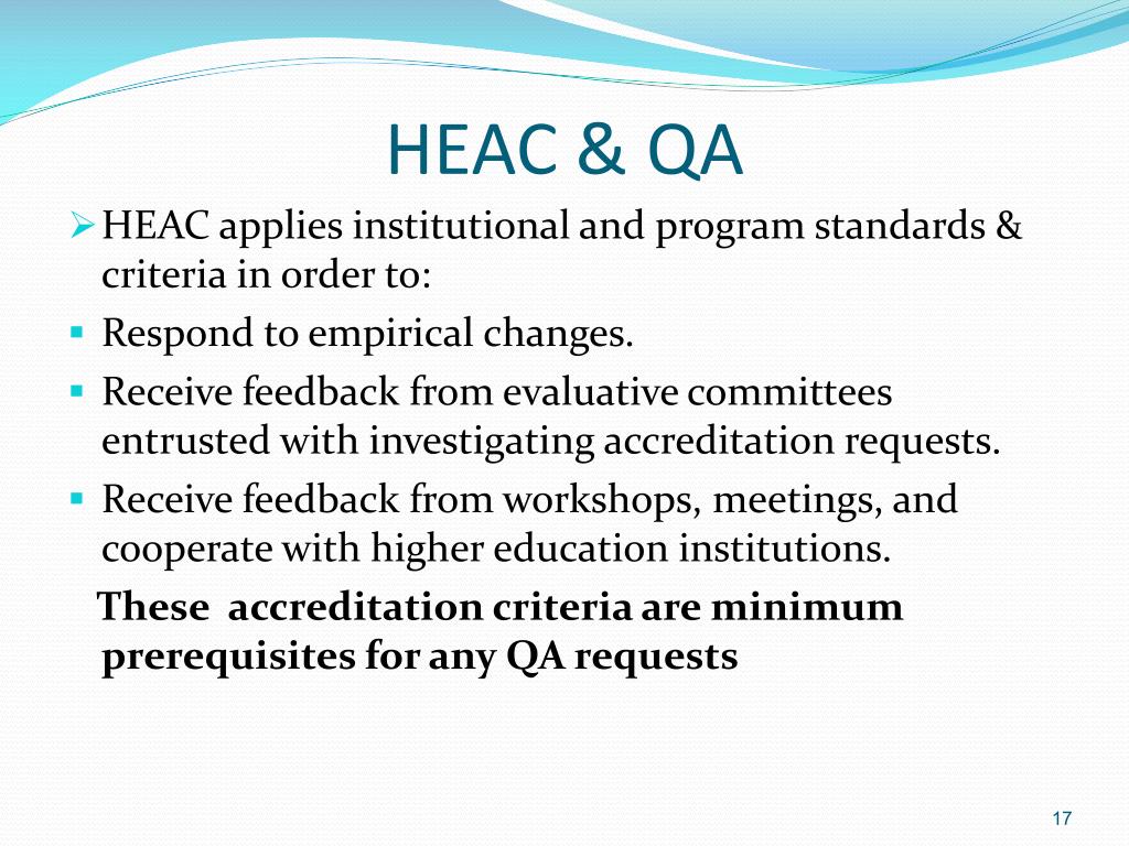 HEAC & QA • HEAC applies institutional and program standards & criteria in order to: • Respond to empirical changes. • Receive feedback from evaluative committees entrusted with investigating accreditation requests. • Receive feedback from workshops, meetings, and cooperate with higher education institutions. These accreditation criteria are minimum prerequisites for any QA requests