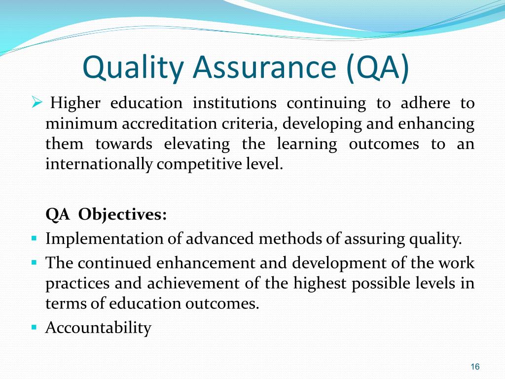 Quality Assurance (QA) • Higher education institutions continuing to adhere to minimum accreditation criteria, developing and enhancing them towards elevating the learning outcomes to an internationally competitive level. QA Objectives: • Implementation of advanced methods of assuring quality. • The continued enhancement and development of the work practices and achievement of the highest possible levels in terms of education outcomes. • Accountability 16