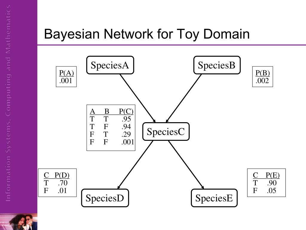 Bayesian Network for Toy Domain SpeciesA SpeciesB P(A) P(B) .001 .002 A B P(C) T T .95 T F .94 SpeciesC F T .29 F F .001 C P(D) C P(E) T .70 T .90 F .01 F .05 SpeciesD SpeciesE