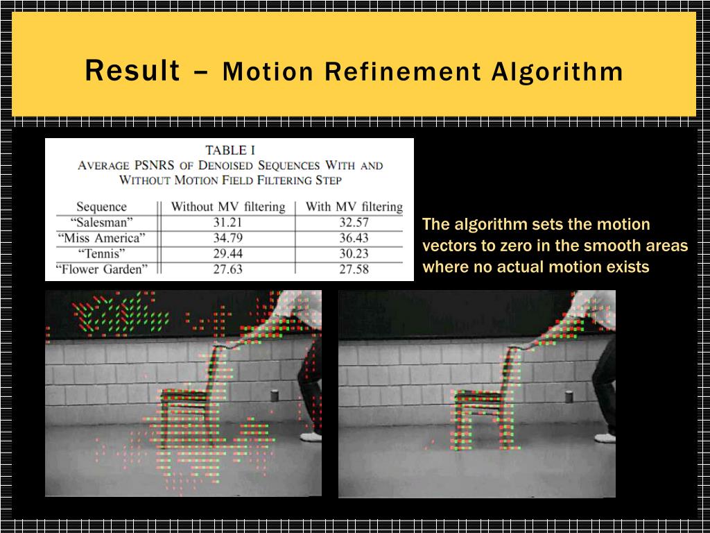 Result–Motion Refinement Algorithm The algorithm sets the motion vectors to zero in the smooth areas where no actual motion exists