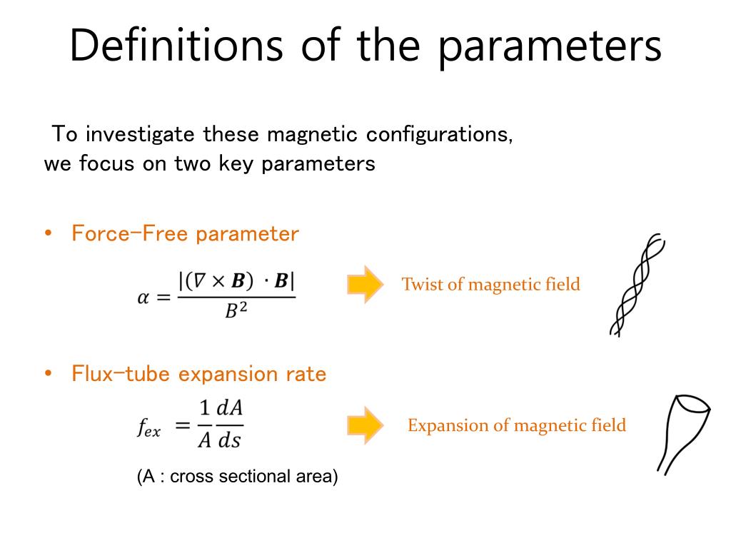 Definitions of the parameters To investigate these magnetic configurations,we focus on two key parameters • Force-Free parameter • Flux-tube expansion rate Twist of magnetic field Expansion of magnetic field (A : cross sectional area)