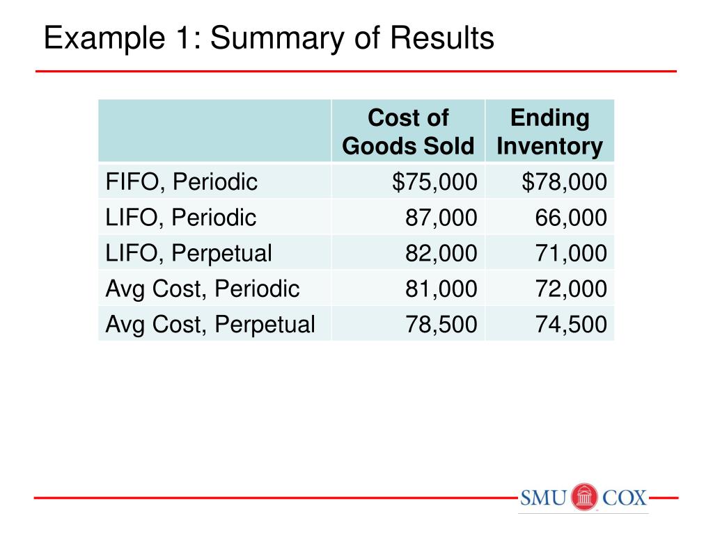Example 1: LIFO Perpetual (Summary) Cost of Goods Sold: Jan 5 3,000 units = $24,000 Jan 12 2,000 units = 18,000 Jan 20 4,000 units = 40,000 Total 9,000 units = $82,000 Ending Inventory: Beg 3,000 units @ $ 8 = $24,000 Jan 10 3,000 units @ $ 9 = 27,000 Jan 18 2,000 units @ $10 = 20,000 8,000 units $71,000