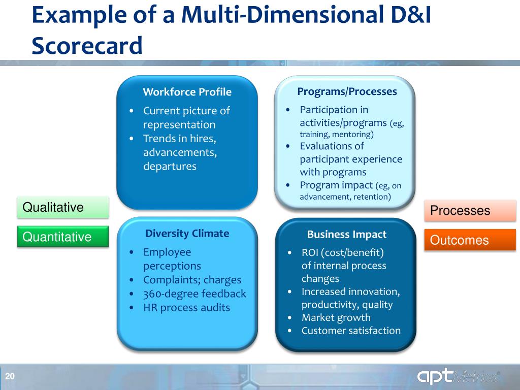Example of a Multi-Dimensional D&I Scorecard • Workforce Profile • Current picture of representation • Trends in hires, advancements, departures • Programs/Processes • Participation in activities/programs (eg, training, mentoring) • Evaluations of participant experience with programs • Program impact (eg, on advancement, retention) Qualitative Processes • Diversity Climate • Employee perceptions • Complaints; charges • 360-degree feedback • HR process audits • Business Impact • ROI (cost/benefit) of internal process changes • Increased innovation, productivity, quality • Market growth • Customer satisfaction Quantitative Outcomes