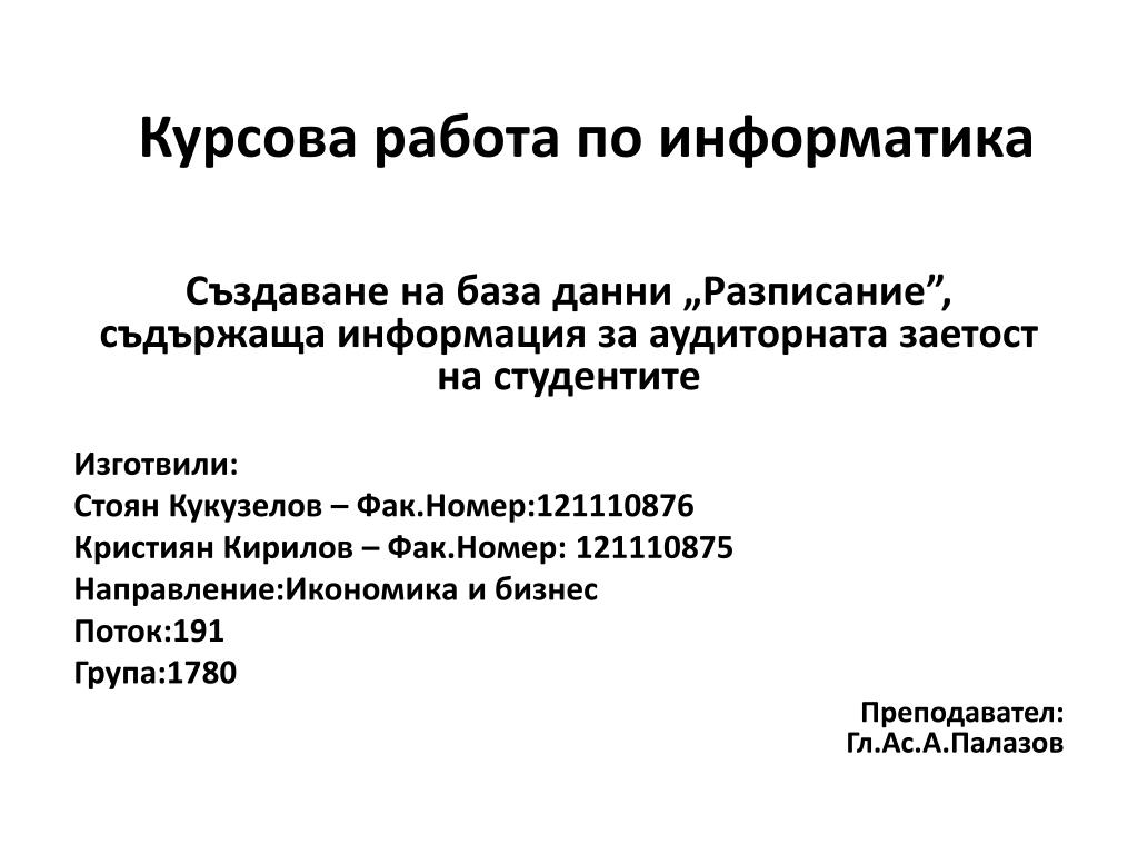 Курсова работа по информатика Създаване на база данни „Разписание”,съдържаща информация за аудиторната заетост на студентите Изготвили: Стоян Кукузелов – Фак.Номер:121110876 Кристиян Кирилов – Фак.Номер: 121110875 Направление:Икономика и бизнес Поток:191 Група:1780 Преподавател:Гл.Ас.А.Палазов