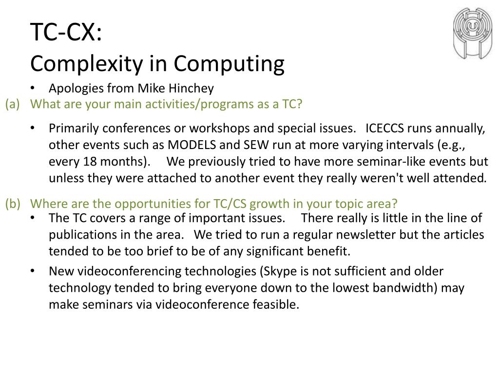 TC-CX:Complexity in Computing • Apologies from Mike Hinchey • Sponsoring varied events which brings recognition, also published a book recently on the topic of "Conquering Complexity". • Few members who attend regularly. There are some but not enough. Also some of the more committed members are close to retirement or have become more senior in their careers and don't has as much time for volunteer activities. (c) How are you working to increase CS member participation? (d) What are the key problems or issues that your TC is facing?