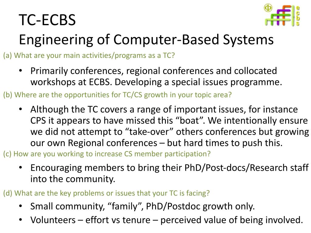 TC-ECBSEngineering of Computer-Based Systems (a) What are your main activities/programs as a TC? (b) Where are the opportunities for TC/CS growth in your topic area? (c) How are you working to increase CS member participation? (d) What are the key problems or issues that your TC is facing? • Primarily conferences, regional conferences and collocated workshops at ECBS. Developing a special issues programme. • Although the TC covers a range of important issues, for instance CPS it appears to have missed this “boat”. We intentionally ensure we did not attempt to “take-over” others conferences but growing our own Regional conferences – but hard times to push this. • Encouraging members to bring their PhD/Post-docs/Research staff into the community. • Small community, “family”, PhD/Postdoc growth only. • Volunteers – effort vs tenure – perceived value of being involved.