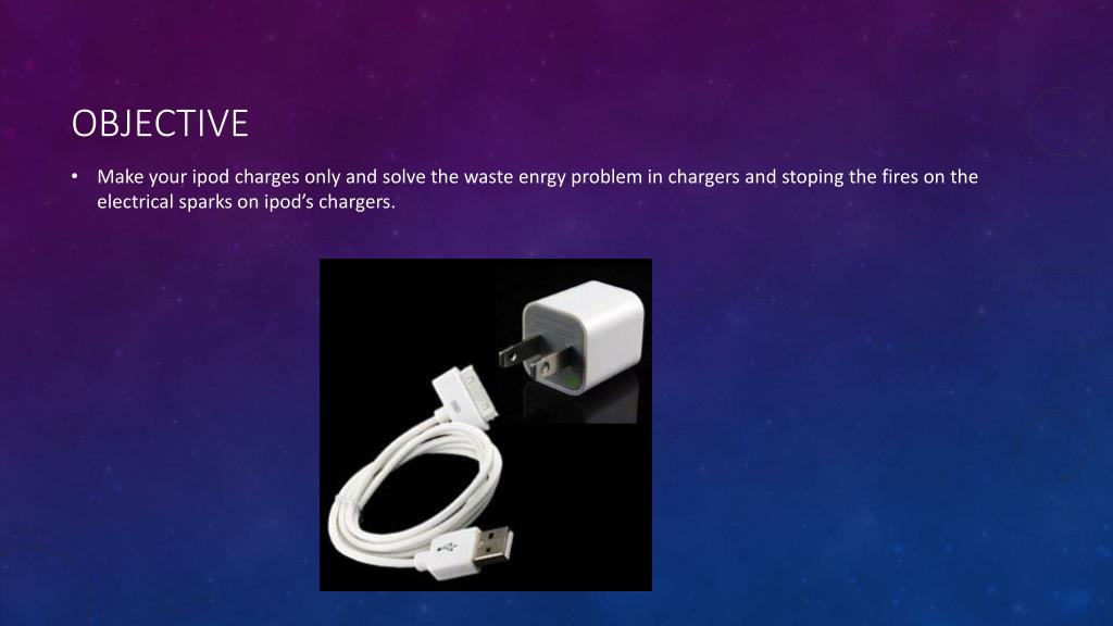 Objective • Makeyouripodchargesonly and solve the wasteenrgy problem in chargers and stopingthe fireson the electricalsparksonipod’schargers.